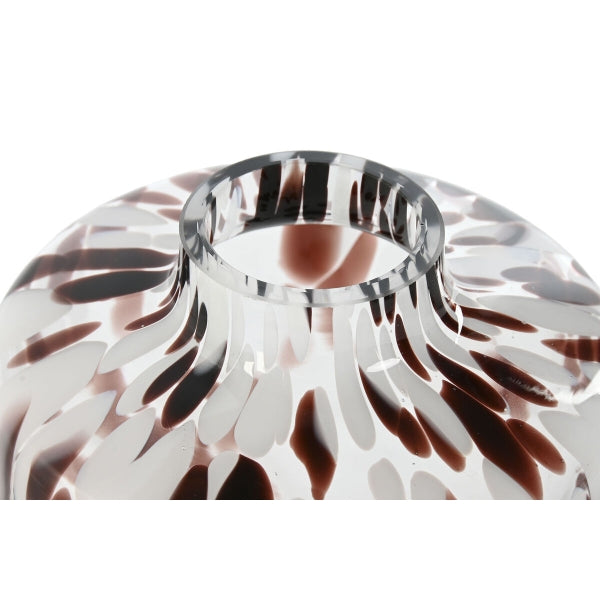 Un oggetto di design che cattura lo sguardo: questo vaso unisce eleganza e originalità con una finitura in cristallo decorato da macchie astratte nei toni del bianco, marrone e nero. La sua forma armoniosa e le sfumature effetto marmorizzato rendono ogni pezzo unico, perfetto per valorizzare ambienti moderni, contemporanei o dal gusto artistico.
